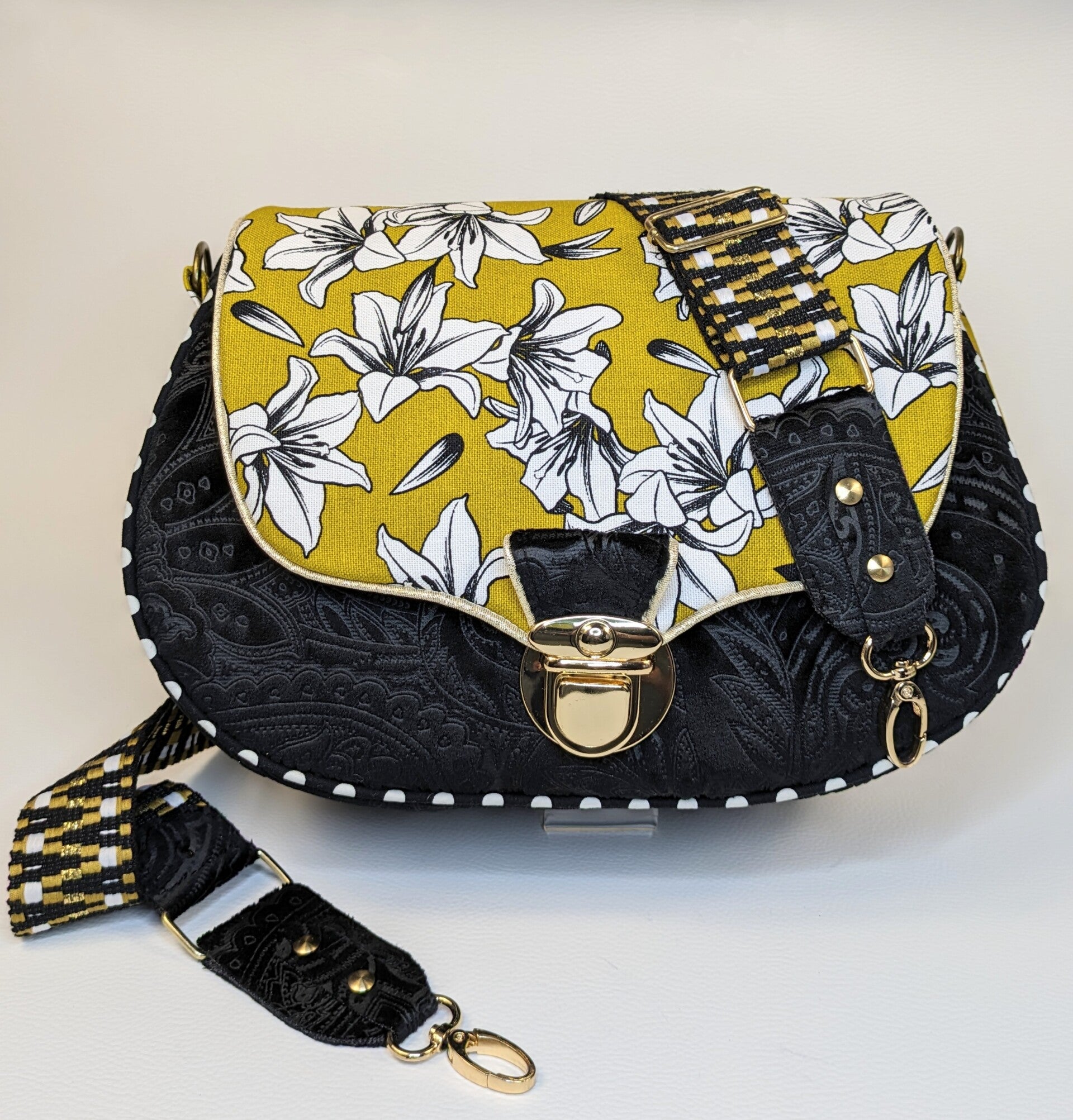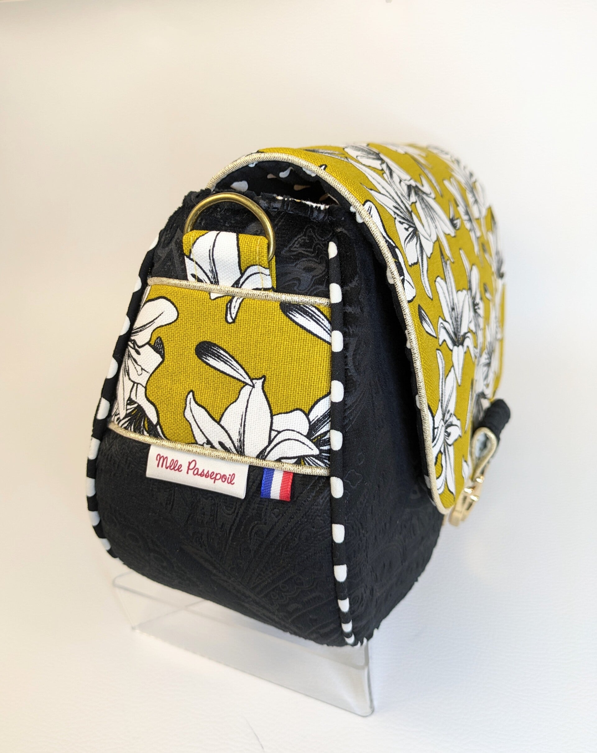 Raffinement et élégance, voici ce qui caractérise la Besace JOSÉPHINE. Un velours ras au noir intense et incrustations Cachemire, un coton moutarde réhaussé de lys noirs et blancs et du passepoil Lurex doré composent cette création et apportent style et modernité.