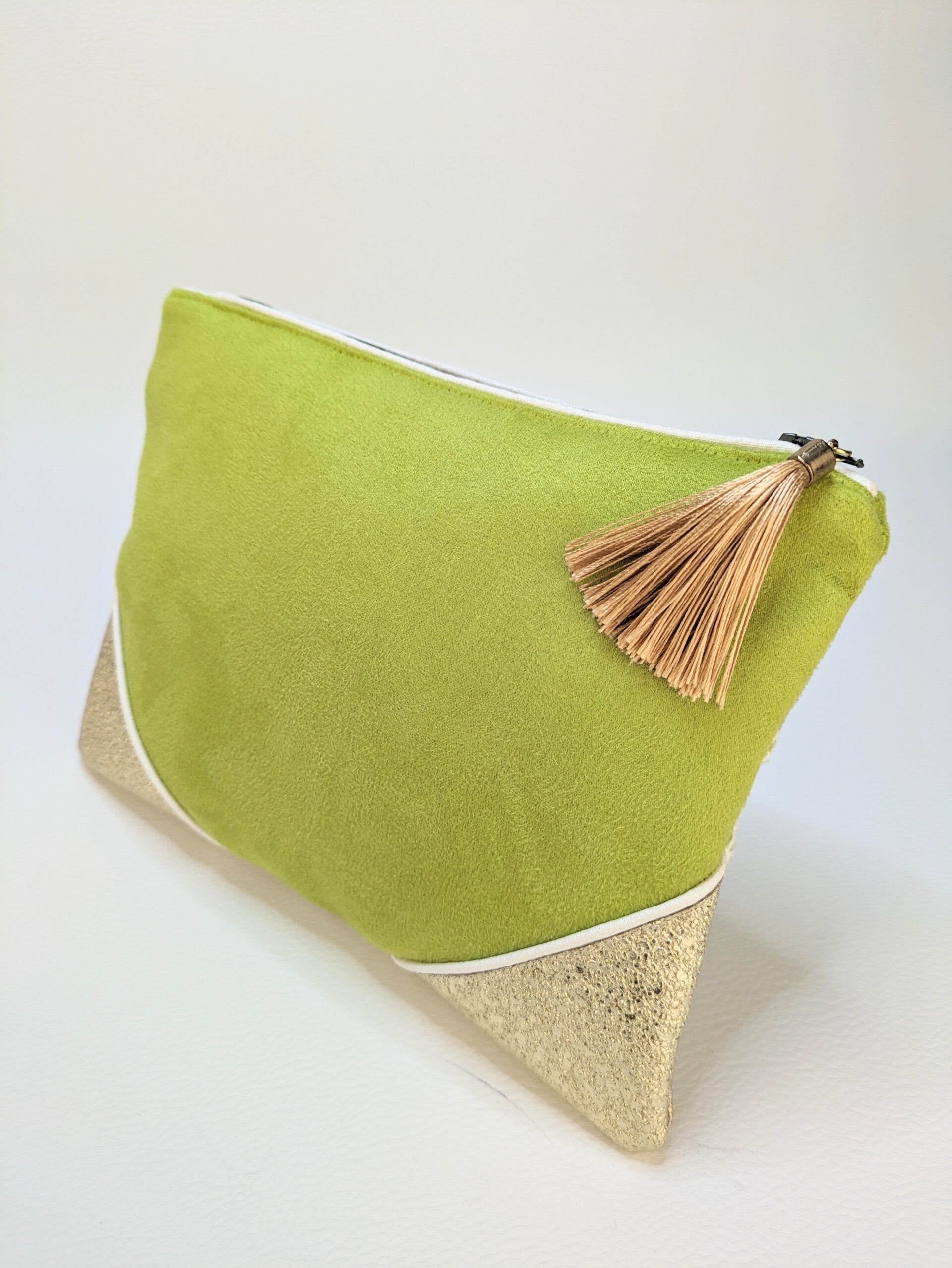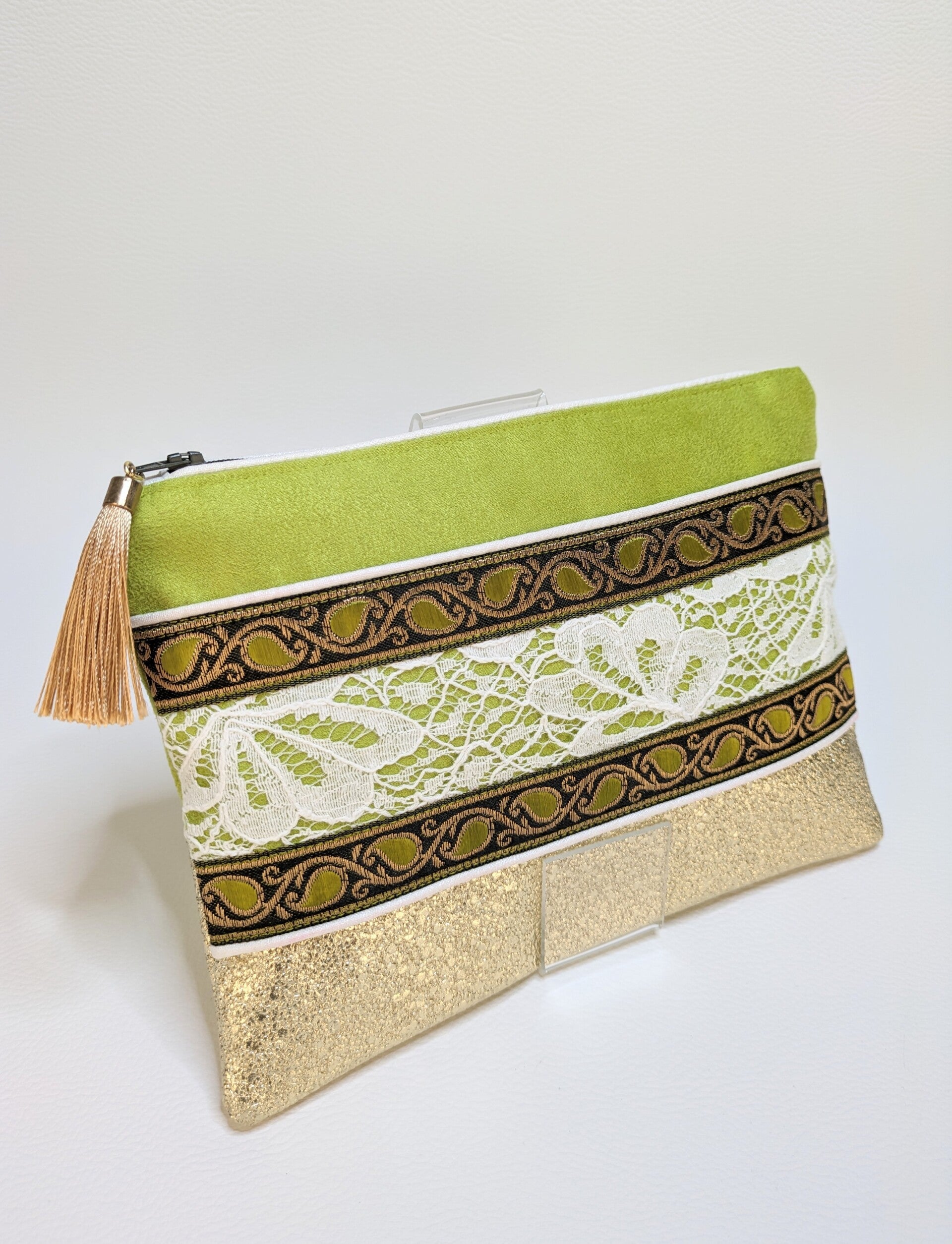 En route pour l’Italie avec cette pochette au style baroque. Une suédine toute douce et du simili Glitter doré qui s’amusent avec la dentelle et un galon aux accents de frise tapissière. On dirait la déco d’un palais toscan…