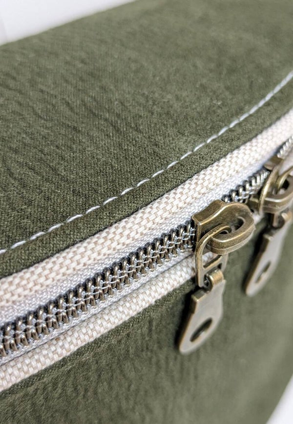 L’intensité du kaki apporte force et profondeur à cette Banane WEST, renforcées par une bouclerie laiton vieilli, et une bandoulière à motifs jacquard qui soulignent son côté masculin.
